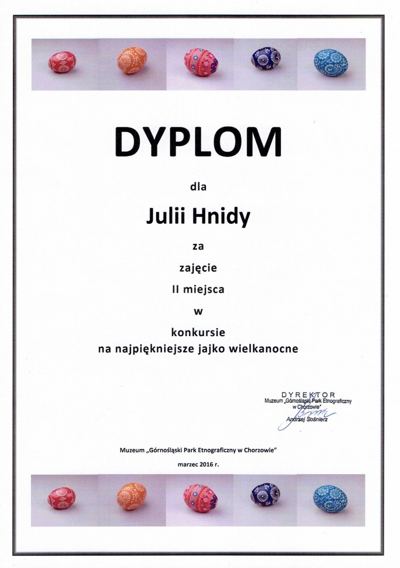 w Rejonowym Konkursie Plastycznym "NAJPIĘKNIEJSZE JAJKO WIELKANOCNE". Organizator: Górnośląski Park Etnograficzny w Chorzowie