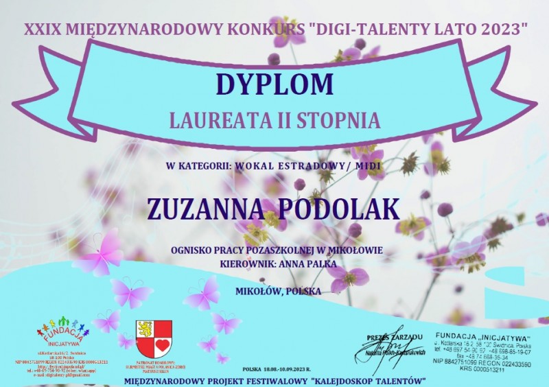 dyplom laureata 2 stopnia dla ZUZANNY PODOLAK